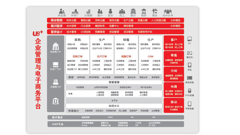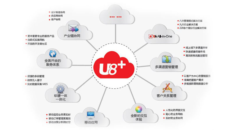 用友U8+作為云時代的產物,針對中國乃至世界市場中型企業的發展特性,為中型企業提供最全面的“軟件+行業方案+云服務”,涵蓋了CRM、電子商務、財務、供應鏈、生產制造、管理會計、人力資源、移動、商業分析與OA等領域的應用。